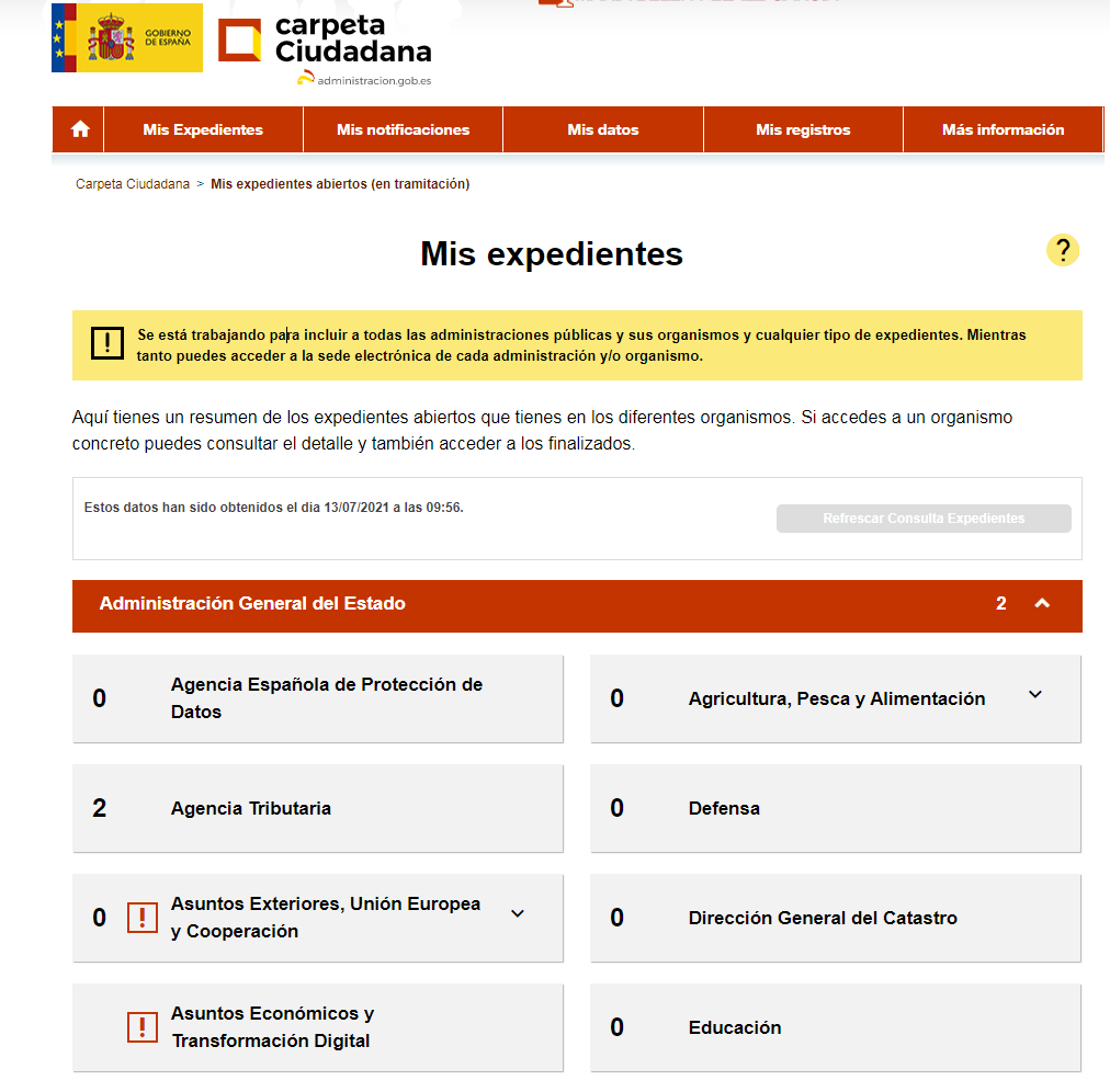 Muestra un resumen con el número de los expedientes que están abiertos o en tramitación en el momento de realizar la consulta, agrupados por ministerio u organismo adheridos al sistema.