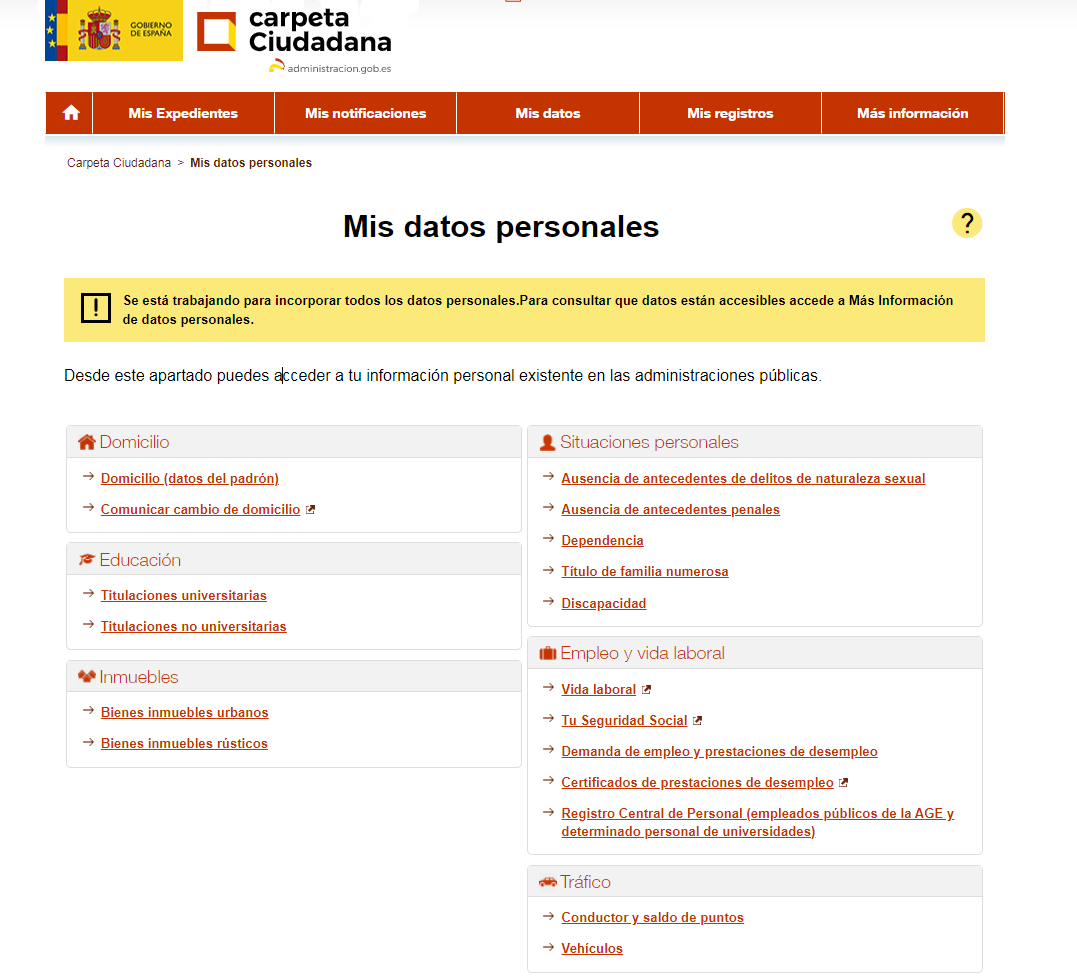 Muestra un resumen de la información personal existente en las administraciones públicas agrupadas por materias.