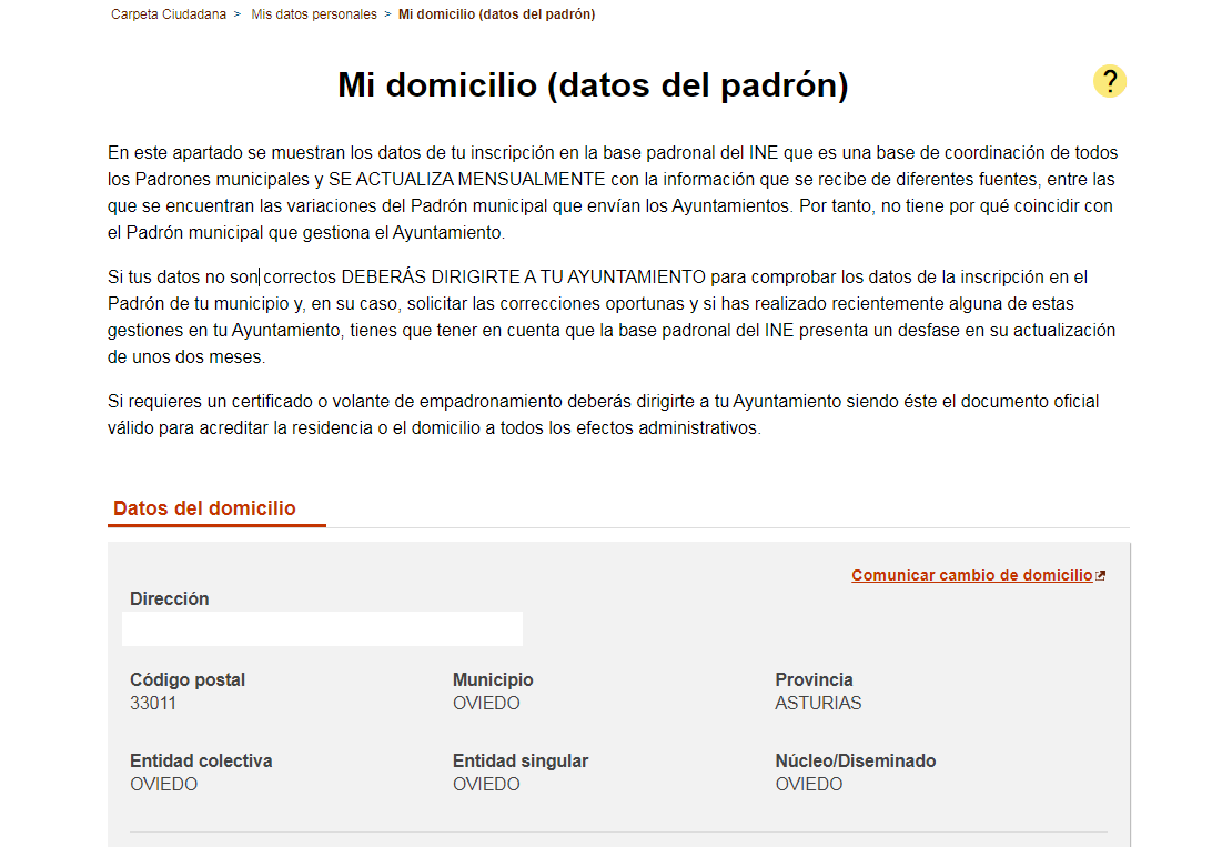 En este apartado se muestran los datos de tu inscripción en la base padronal del INE que es una base de coordinación de todos los Padrones municipales y SE ACTUALIZA MENSUALMENTE.